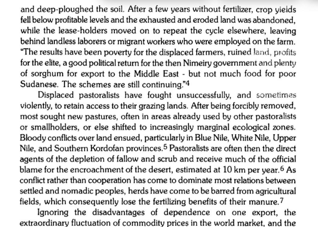 The UK colonized Sudan in the late 19th century, and structured its economy to produce one export commodity (cotton). It still primarily produced cotton and other cash crops (sesame, peanuts, &c.) after independence, until the end of the 20th century. socsci.uci.edu/~vbernal/bio/B…