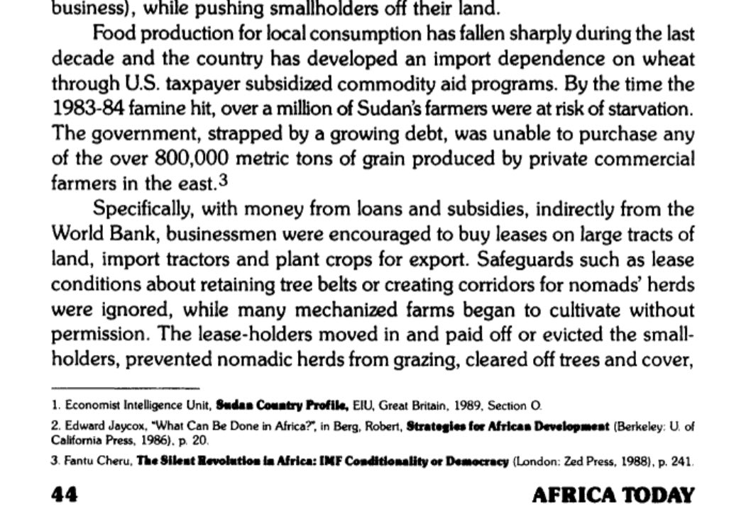 Sudan endured its first IMF structural adjustment program in 1978; land was seized from the peasants, often without compensation, and farmed unsustainably, leading to famine and a new civil war in 1983