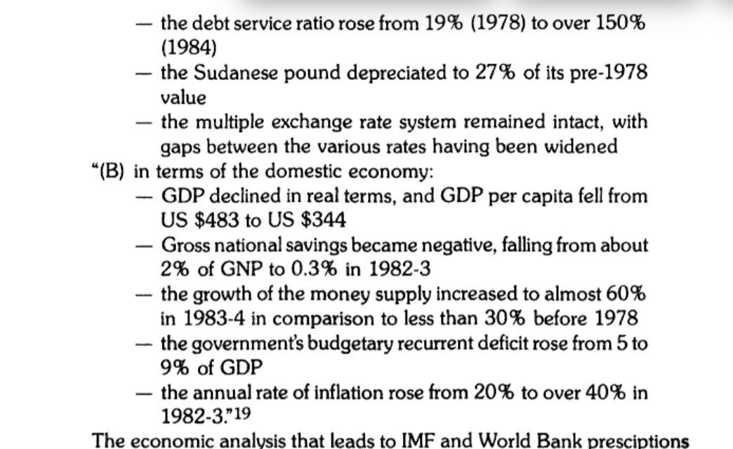 Structural adjustment thus “failed”. Western financial institutions' true goal in Sudan was to maintain its underdevelopment. After seven years of structural adjustment, the economy was in shambles, people were starving, and a civil war was raging. jstor.org/stable/4186585