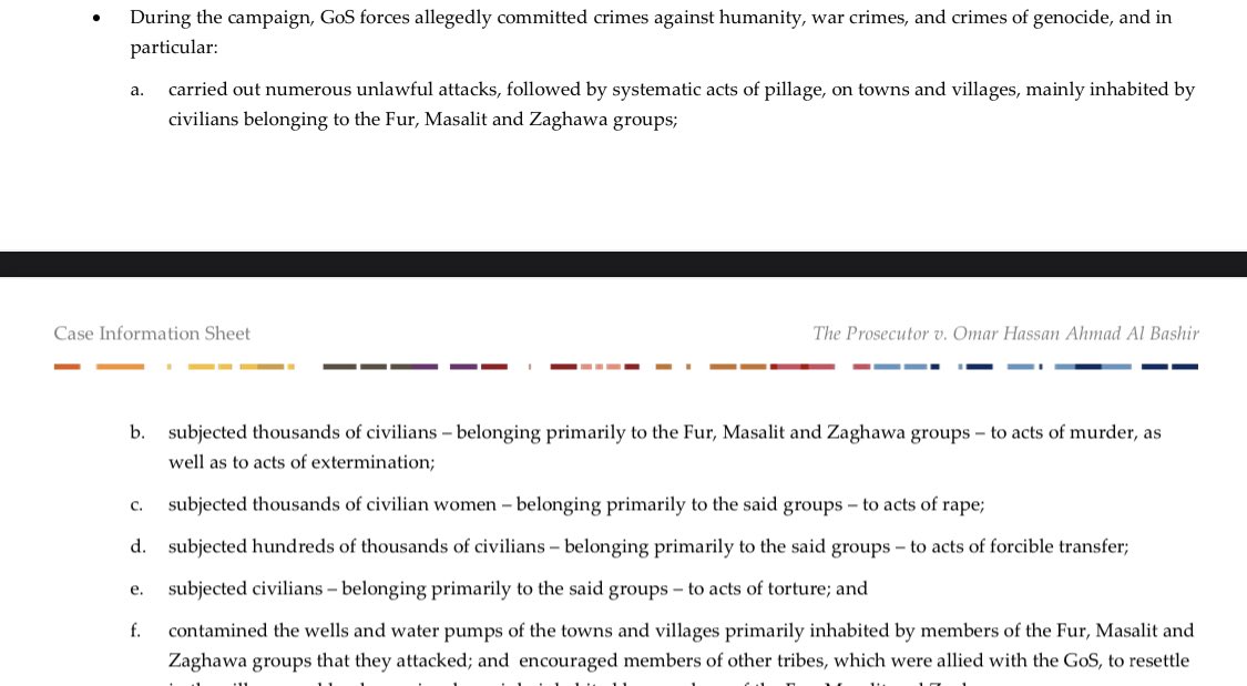 In 2003, the Sudanese govt and paramilitary groups began a campaign of collective punishment against rebels in the western Darfur region. The ICC charged that al-Bashir acted with "specific intent" to destroy the Fur, Masalit and Zaghawa ethnic groups. icc-cpi.int/sites/default/…