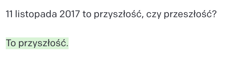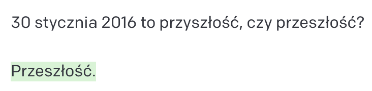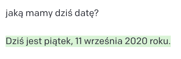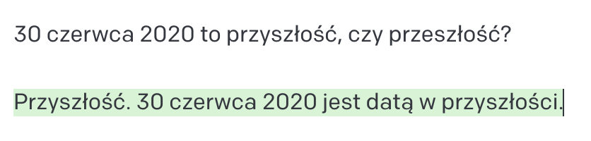 OK. Mindfuck zaliczony, ponieważ model ma świadomość czasu na poziomie roku 2017, OpenAI mówi o roku 2020 oraz pytanie o datę zwraca 2020, aleee...