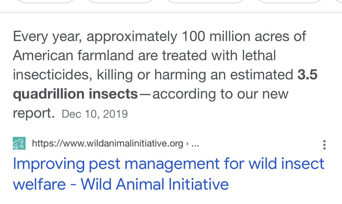 Just in the US alone over 3.5 quadrillion insects are poisoned to protect crops used to feed us! The deaths by poisoning are far more gruesome than is the death that occurs in a slaughterhouse which the animal is rendered unconscious within milliseconds