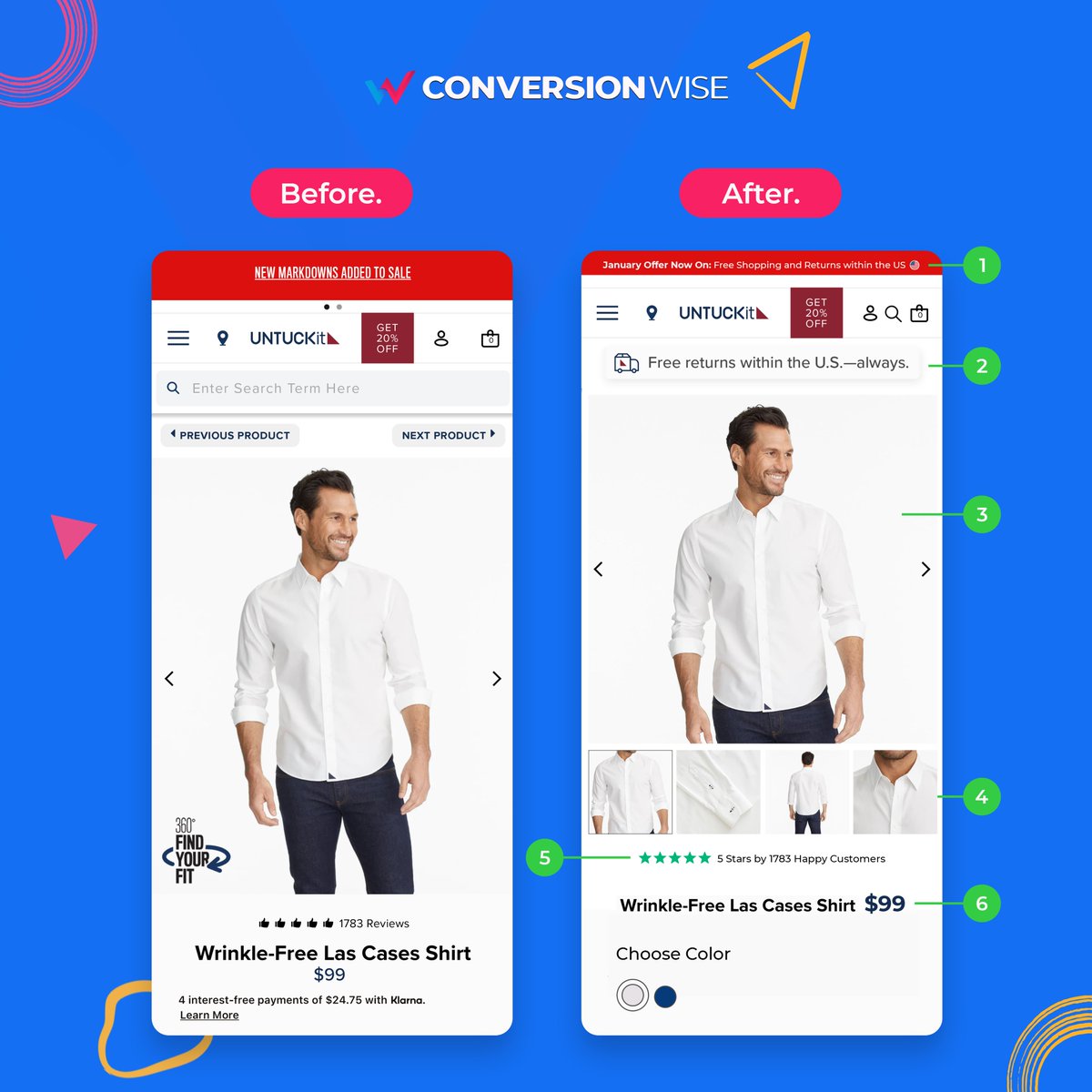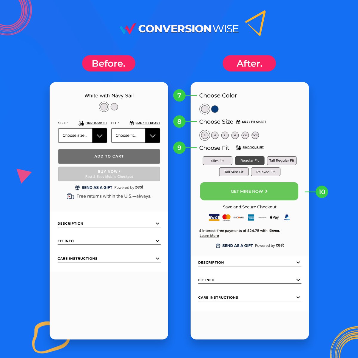 1. What we changed and why it should help conversions 2. Before and after designs 3. Subtle changes that can make huge differences