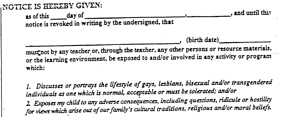 5/ Kari founded the Citizens Research Institute in the 1980s and fought to prevent schools from teaching "homosexual propaganda." Their Declaration of Family Rights is a bizarre legal notice that a child cannot be exposed to anything that portrays LGBTQ2S+ people as "normal."