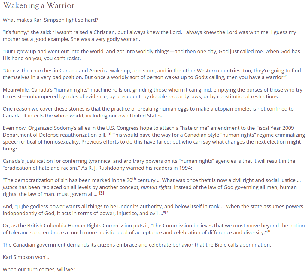 8/ In 2008, Kari told Christian fundamentalists: "Unless the churches in Canada and America wake up...they're going to find themselves in a very bad position...once a worldly sort of person wakes up to God's calling, then you have a warrior." (The org is a @splcenter hate group.)