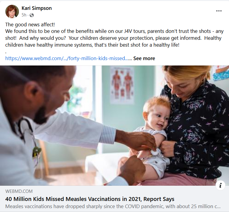 14/ Kari & Doctors on Tour weaponized lower science literacy & worries around vaccines the same way Kari & Culture Guard weaponized fear of trans people: The gov't is coming for your children. Big Pharma coming for your children. They want you sick. Fight back. Save the children.