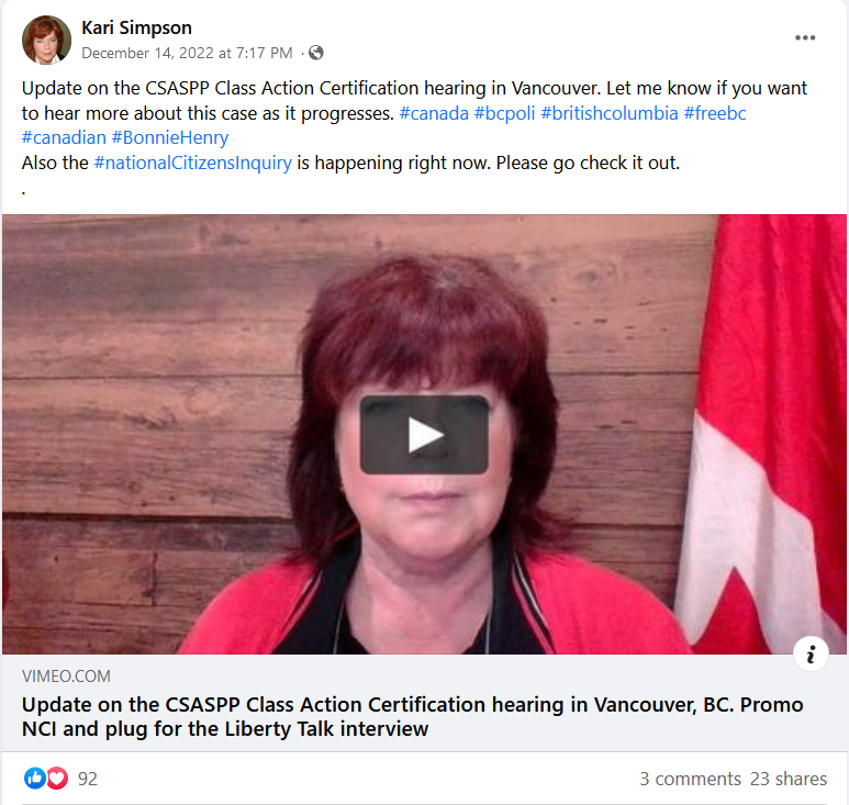 17/ Justice for the Vaccinated ended their tour in Nov 2022 & Kari Simpson has a new hobby: commentating on the Canadian Society for the Advancement of Science in Public Policy's* class action certification hearing for the far-right RoadKill Radio. (*CSASPP/SueBonnie-dot-ca)