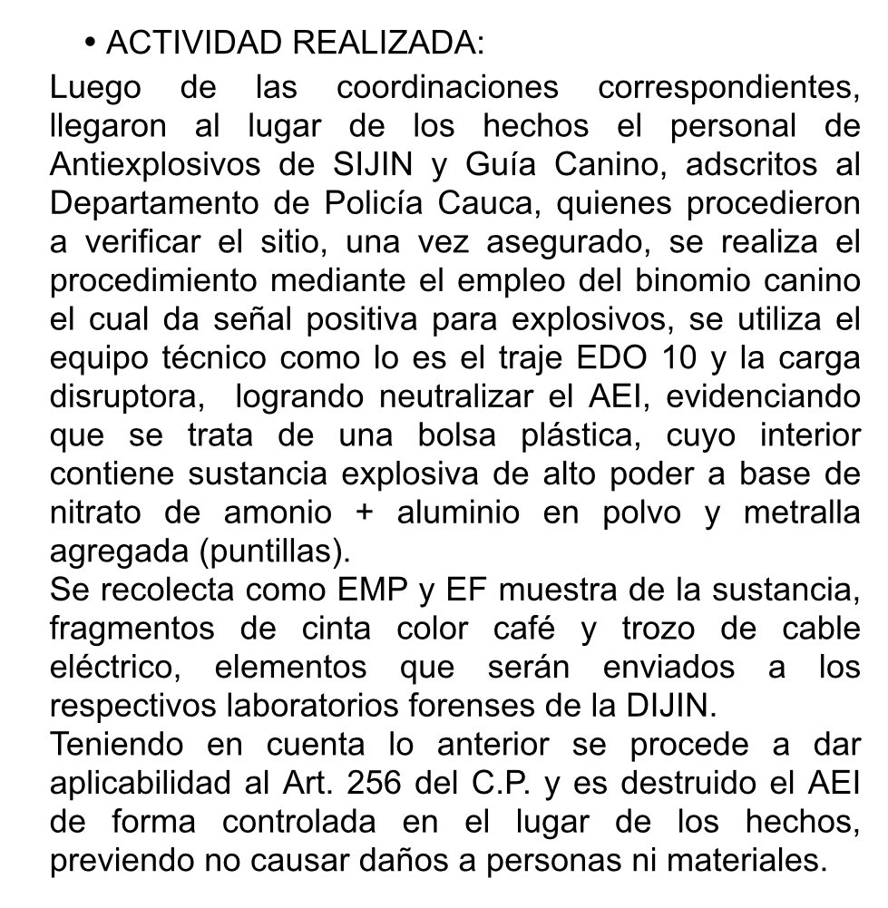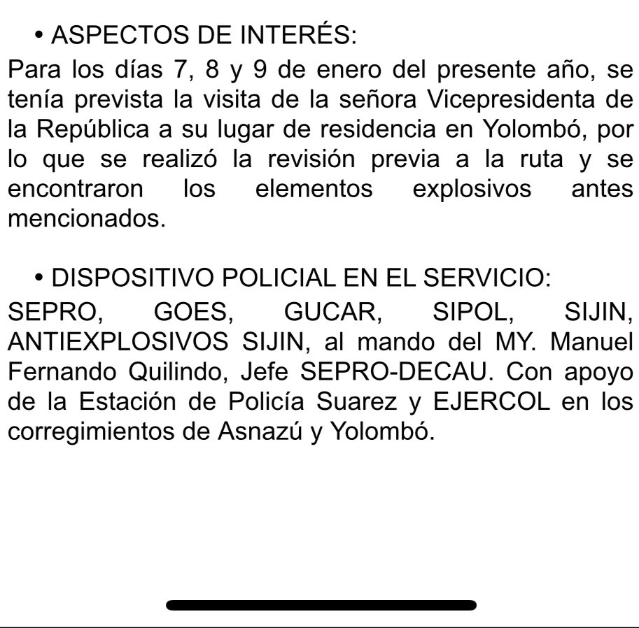 Integrantes de mi equipo de seguridad hallaron un artefacto con más de 7 kilos de material explosivo en la vía que conduce a mi residencia familiar en la vereda de Yolombó, en Suarez, Cauca. El mismo fue destruido de manera controlada por personal anti explosivos de la SIJIN.