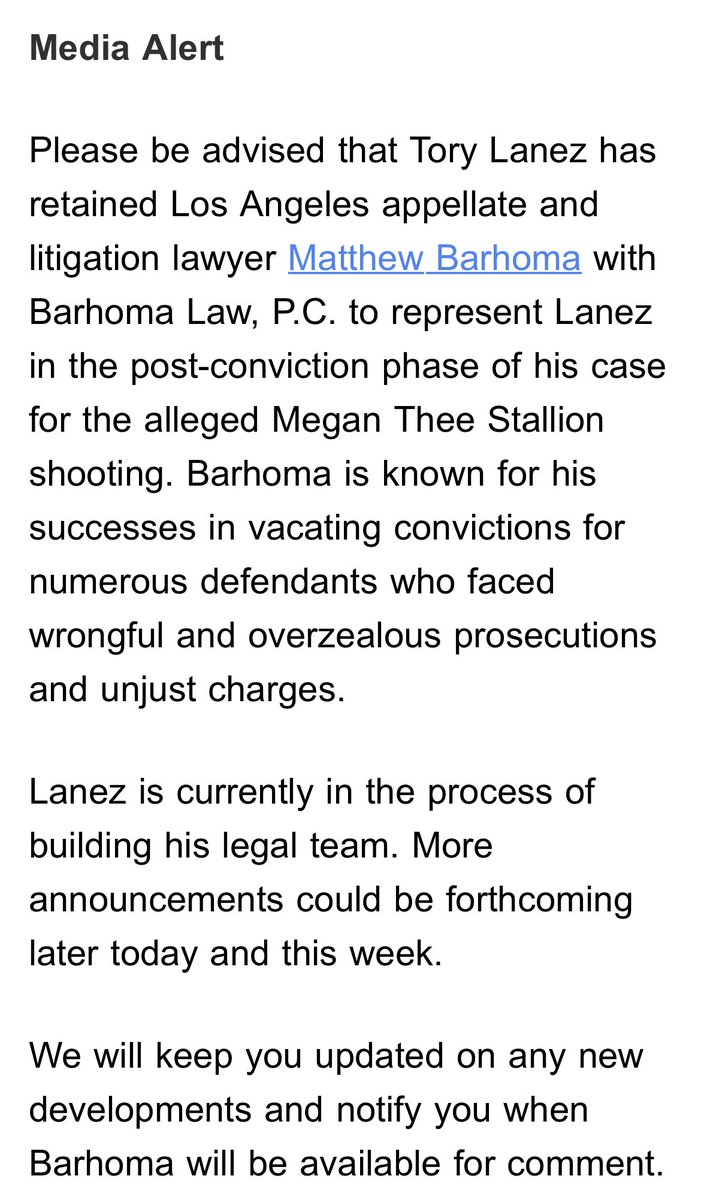 Just in: Tory Lanez has another new lawyer, in addition to David Kenner. Matthew Barhoma “is known for his successes in vacating convictions for numerous defendants who faced wrongful and overzealous prosecutions and unjust charges.” He is in the hallway with Kenner now.