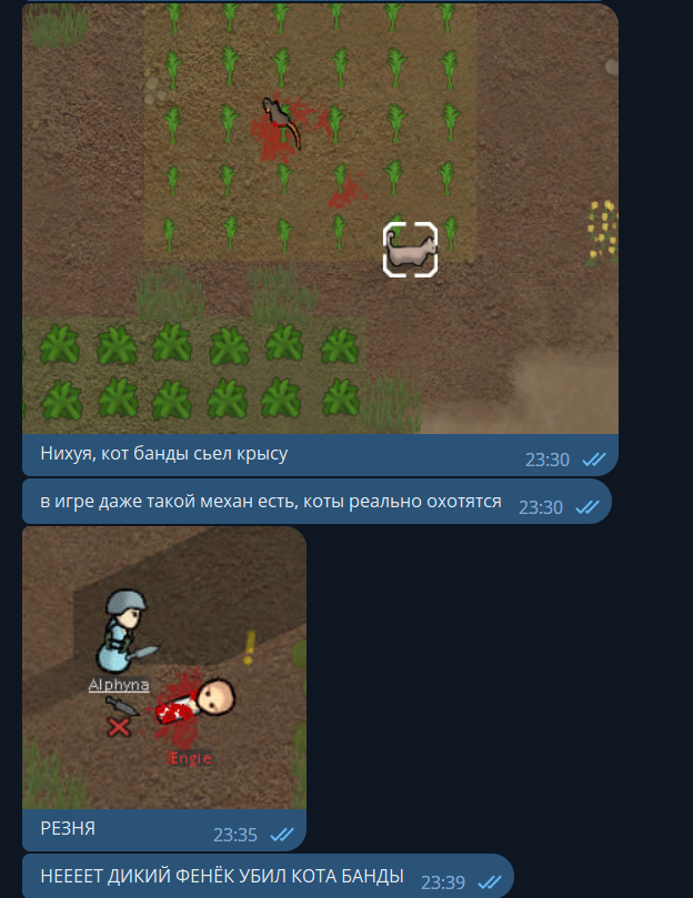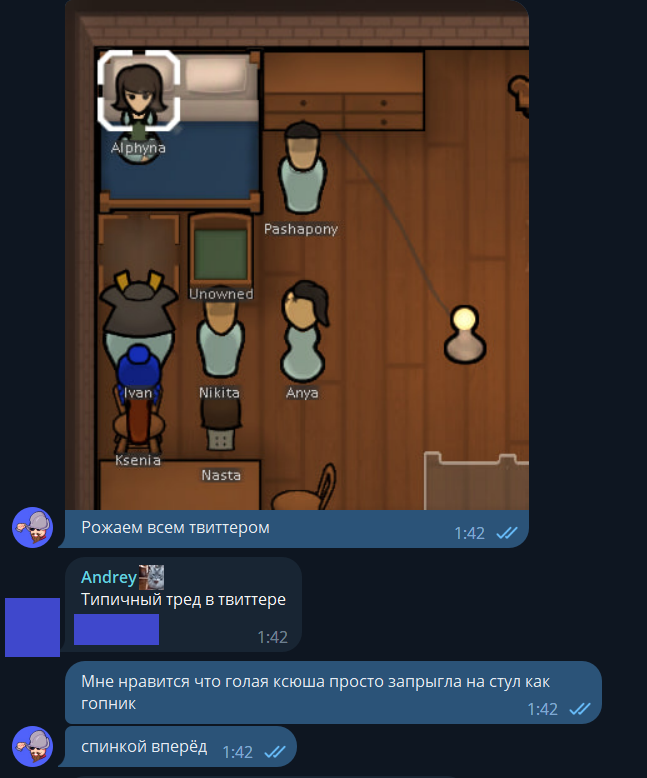 Как вы могли понять по описанию команды, самые главные шизы — Андрей и Альфина. Один — маньяк с пушкой, вторая — маньяк с ножом.