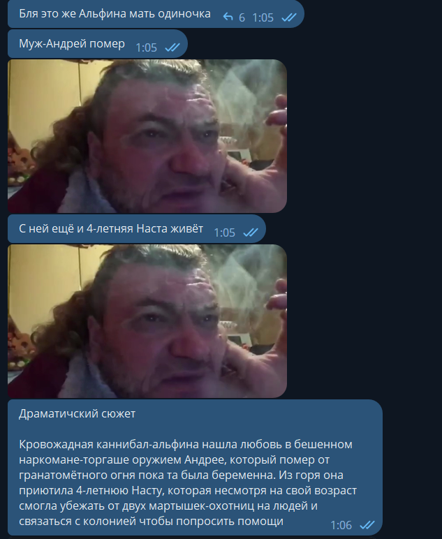 Несмотря на свой маленький возраст, она смогла убежать от 2 мартышек-убийц и запросить помощи у твиттерских. Те быстро помогли — Альфина зарезала к хуям всех мартышек и взяла Насту к себе.