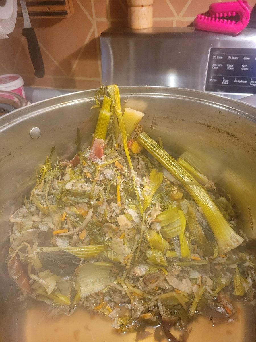 It is rich and flavorful. Leeks, dandelion greens, cabbage, fennel, peppers, onions, garlic, carrots, celery and garlic.