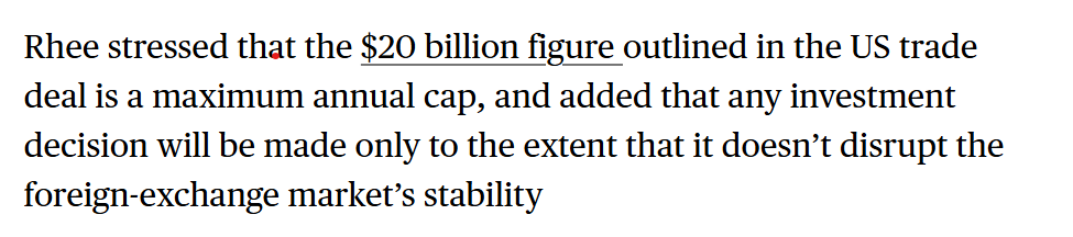 Rhee also emphasized the foreign exchange implications of Korea's investment pledge (part of its "deal" with Lutnick and Trump). Rhee "vowed to oppose any US investment decisions that could threaten the stability of the foreign-exchange market"