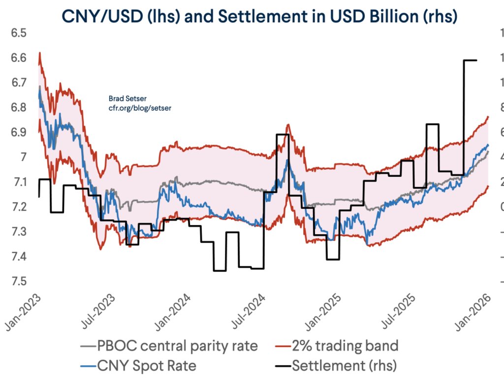 It is quite clear that state bank purchases (and in 23/ early 24 sales) of fx have replaced PBOC purchases and sales and the core technique China uses to manage the band around the daily fx -- i.e. settlement looks like an intervention variable