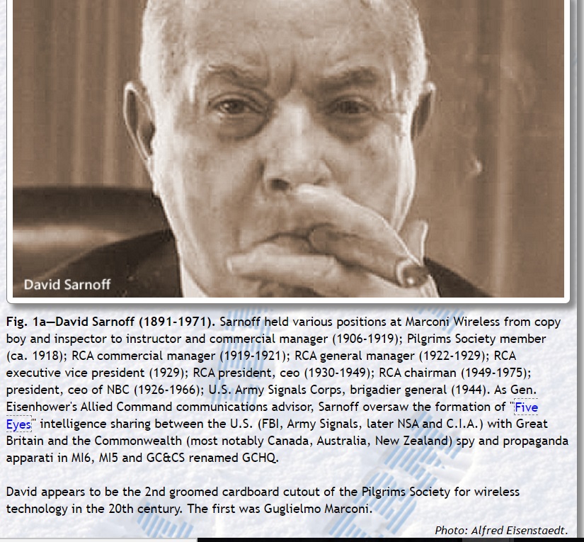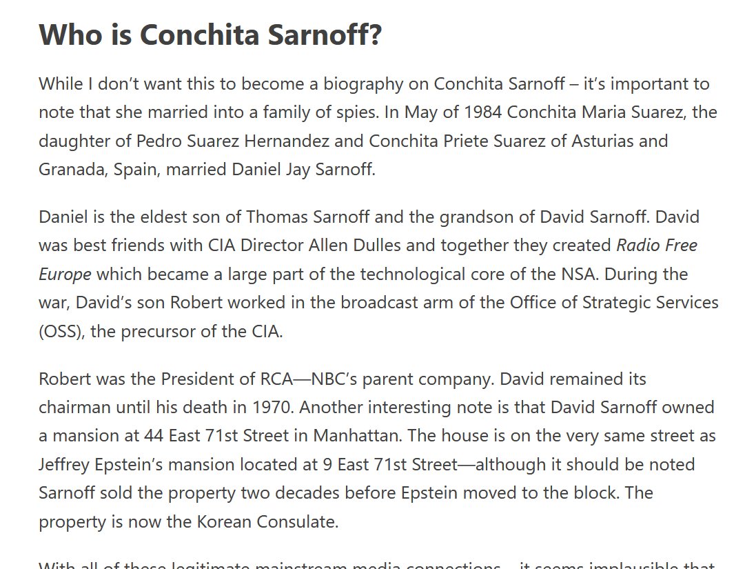 "Who is Conchita Sarnoff?.. married Daniel Jay Sarnoff.. eldest son of Thomas Sarnoff and the grandson of David Sarnoff. David was best friends w/ CIA Director Allen Dulles & together they created Radio Free Europe which became a large part of the technological core of the NSA..