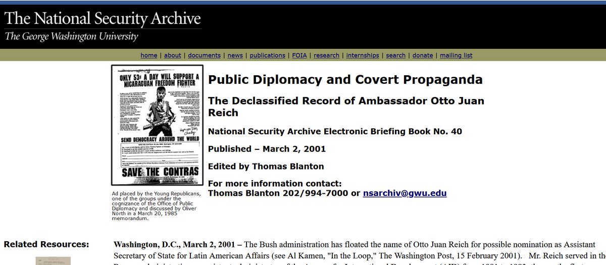 "Otto Juan Reich (born 1944 or 1945) is an American diplomat and lobbyist who worked in the administrations of Presidents Ronald Reagan, George H.W. Bush, and George W. Bush. He has been dubbed a “political thug” who is “eternally implicated in secret CIA networks”.."