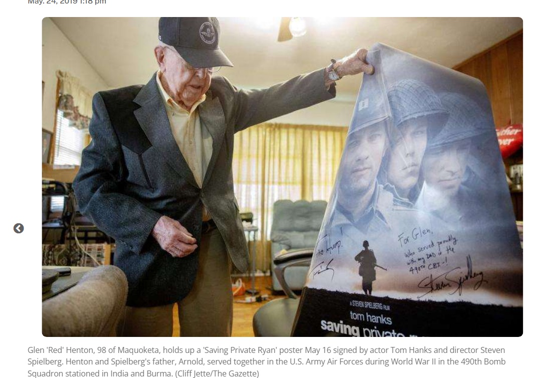 Glen 'Red' Henton, 98 of Maquoketa, holds up a 'Saving Private Ryan' poster signed by actor Tom Hanks and director Steven Spielberg. Henton and Spielberg's father, Arnold, served together in the U.S. Army Air Forces during World War II in the 490th Bomb Squadron
