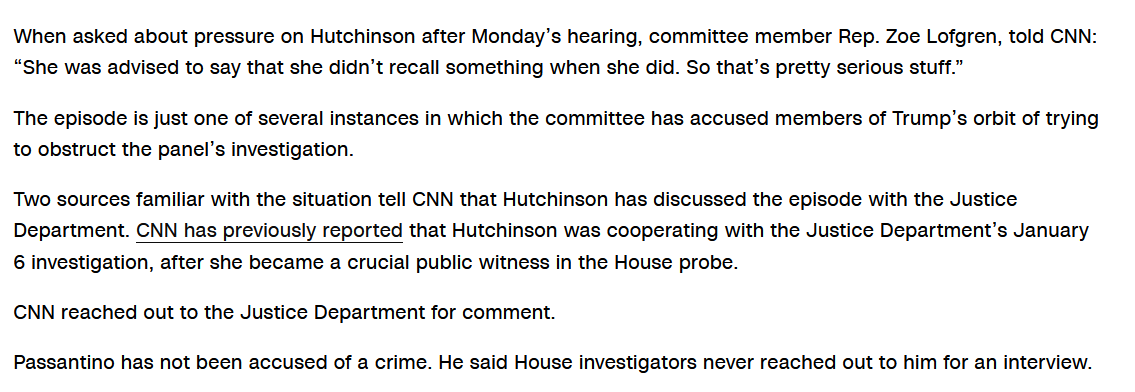 Hutchinson has been interviewed by the DOJ, likley FBI about her attorney's efforts to get her to testify falsely to Congress.