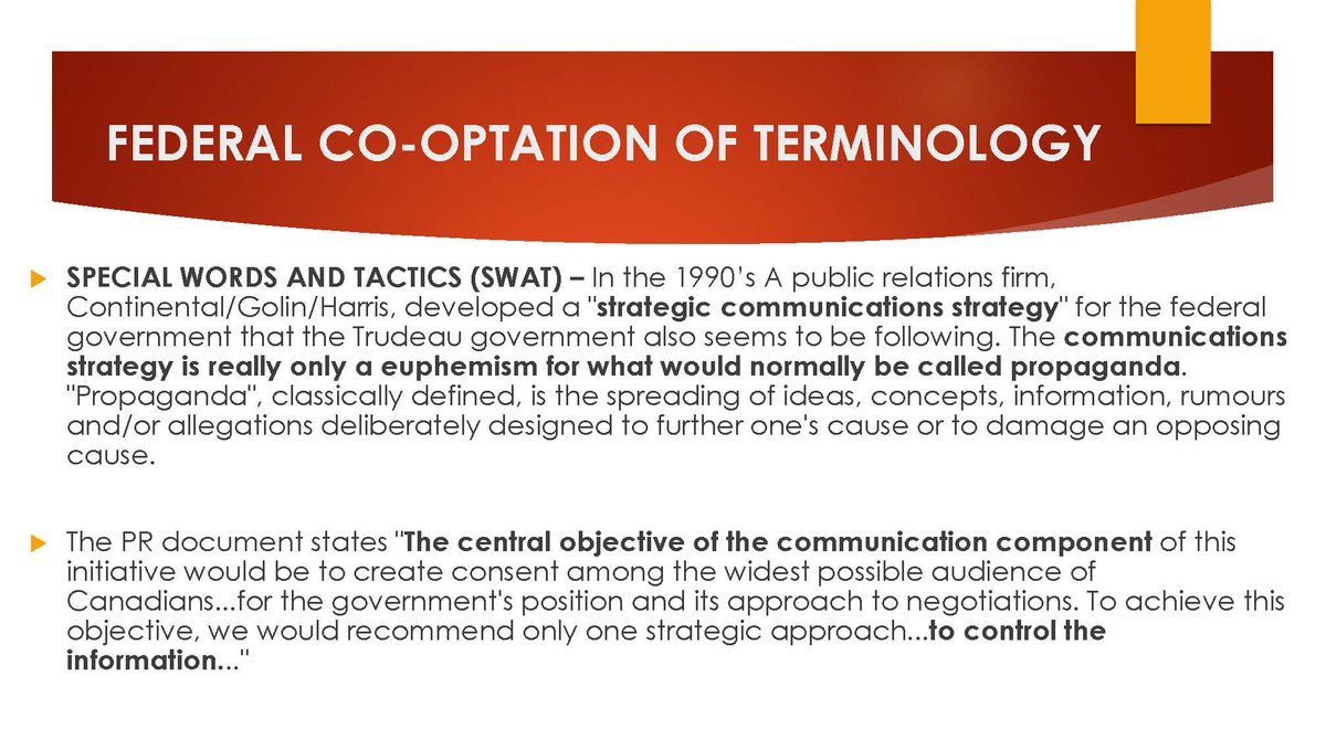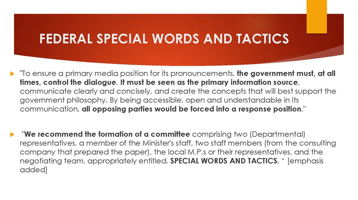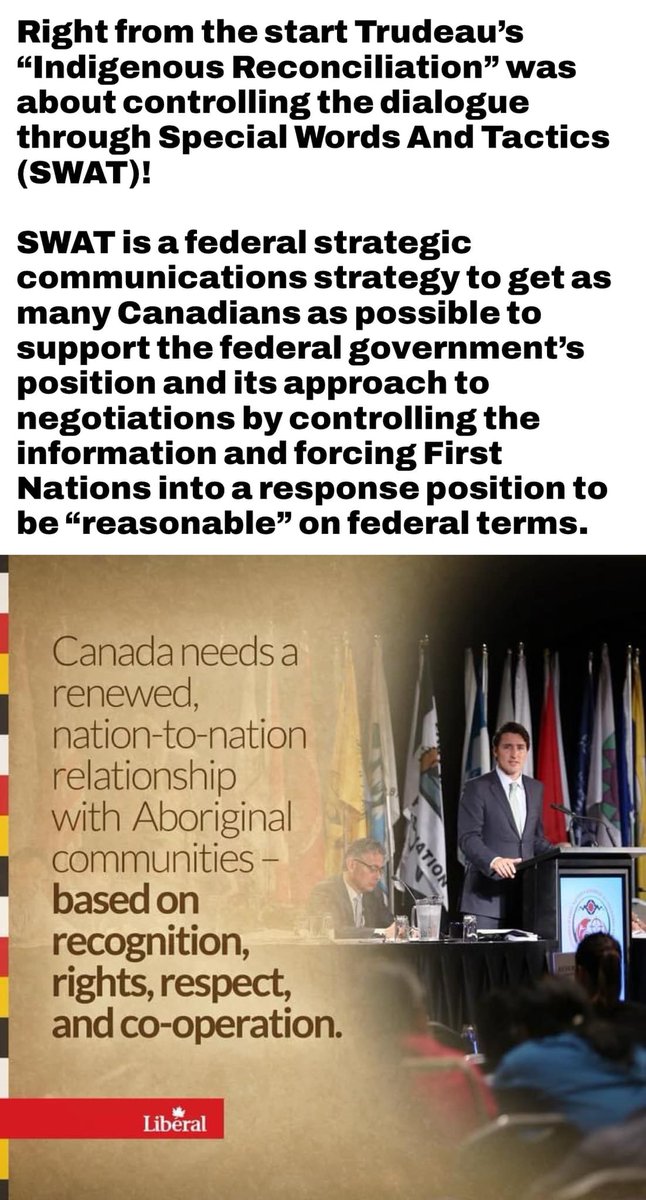 Under the Trudeau gov't a SWAT (Special Words And Tactics) strategy was successfully used to rebrand Liberal's 1969 White Paper Termination Plan into a "Reconciliation" process using AFN (& other NIO's) as a major tool in feds top down approach to "Indigenous" legislation. 3/8
