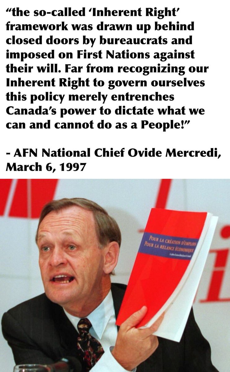 Let's recall in 1995, based on 1969 White Paper, PM Jean Chretien imposed an "Inherent Right" 2 self-gov't policy that recognized "Inherent Right" in abstract not 2 any group & w/ pre-conditions 2 negotiations that convert legal status of FN's into ethnic municipalities. 4/12