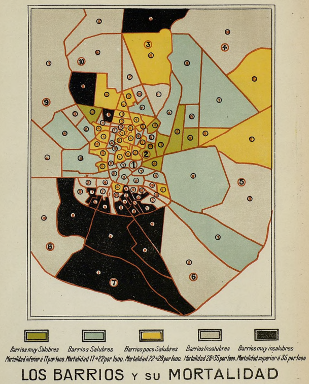 En 1914 la tasas de mortalidad más altas en Madrid se concentraban en los barrios del sur, los más precarios de la ciudad🧵👇