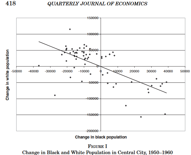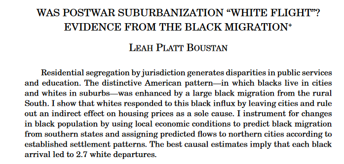 Según una investigación de @leah_boustan por cada persona negra que llegaba a la ciudad central, se iban 2 blancas a los suburbios👇