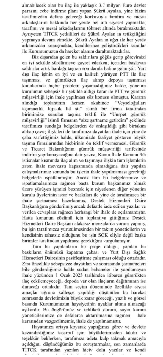 5- İstifa mektubu sunulduktan sonra Çırakoğlu görevden alınmış.Mektupta ilaç alımında tasarruf yöntemlerini engelleyen kişi olarak ise eski AKP Milletvekili olan Şükrü Ayalan'ın olduğu açık açık yazılmış.