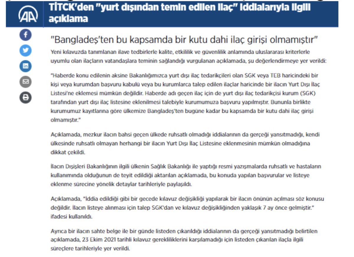 18-TİTCK’nın kılavuzda yaptığı değişiklik ile Bangladeş ilaçlarına bir günde yol açıldığı iddia edildi. Bakanlık bu iddiayı yalanladı.