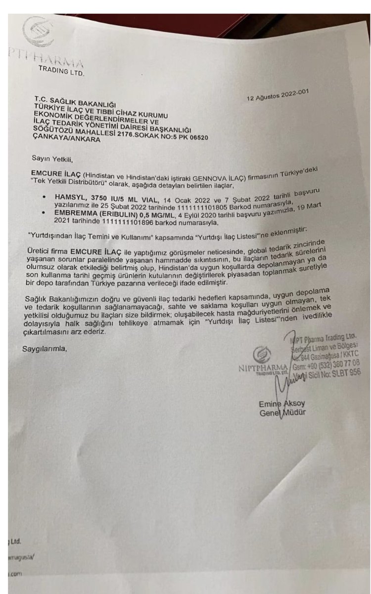28-TİTCK’ya hitaben yazılmış bu dilekçe EMCURE adlı ilaç şirketinin tedarik zincirinde yaşanan sıkıntılardan dolayı sorun yaşanmaması için şirkete ait ilaçların “Yurtdışı İlaç Listesi”nden ivedilikle çıkarılmasını istiyor.