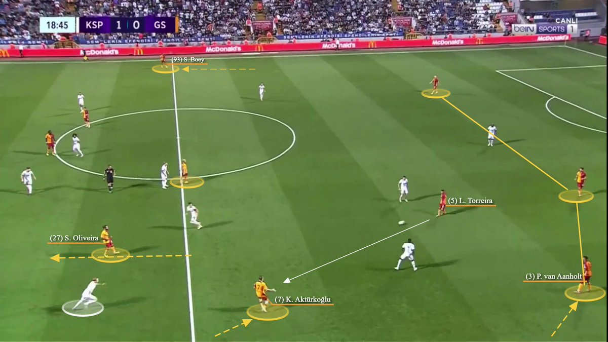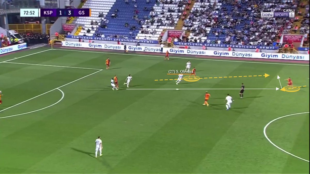 12 - Geri hattan top alan Torriera , orta alana gelen Kerem'e keskin bir pas atıyor ve Kerem'in Oliveira'ya alan açan koşusu ve pasıyla rahat bir blok kırma örneği gösteriyor.
