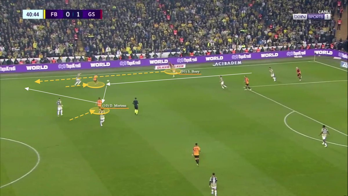 Sıkı bir planla yapılan bu durum, arka hatta prese karşı 3'e 2 sayısal avantaja sahip olmak için çizgiye konumlanan Boey'le ve 3. adam Mertens'in doğru kullanımıyla presten çıktılar.