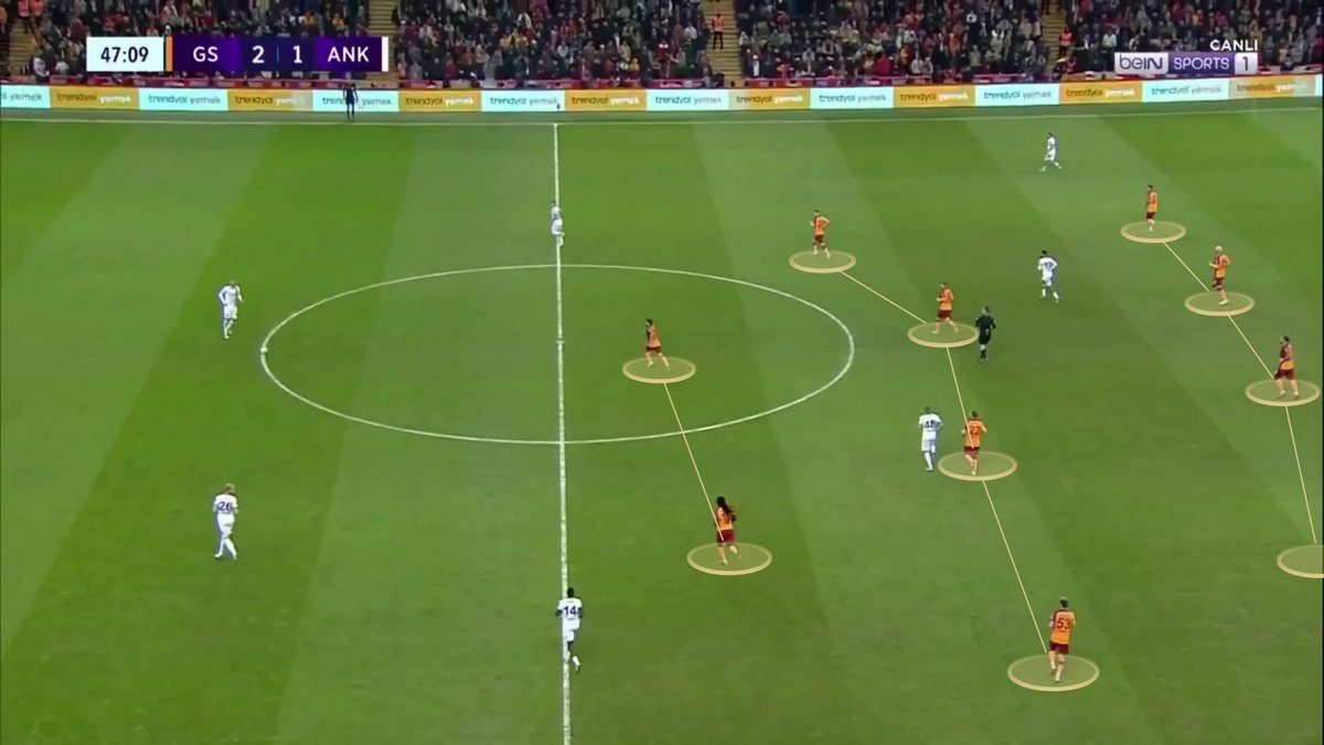 10 - Kasımpaşa'nın yüksek baskısı karşısında Galatasaray 3-1'lik üstünlük kurdu. Burada Dries Mertens rakibin 6 numaralı bekini kenetlerken, Kerem Aktürkoğlu rakibin bekini sürüklerken Lucas Torreira ile Sergio Oliveira arasındaki farklı roller ön plana çıkarıldı.