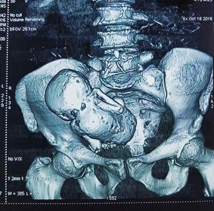 En la imagen nos muestra una tomografía 3D de una anciana de 71 años que lleva a su hijo calcificado hace más de 30 años en el vientre.
