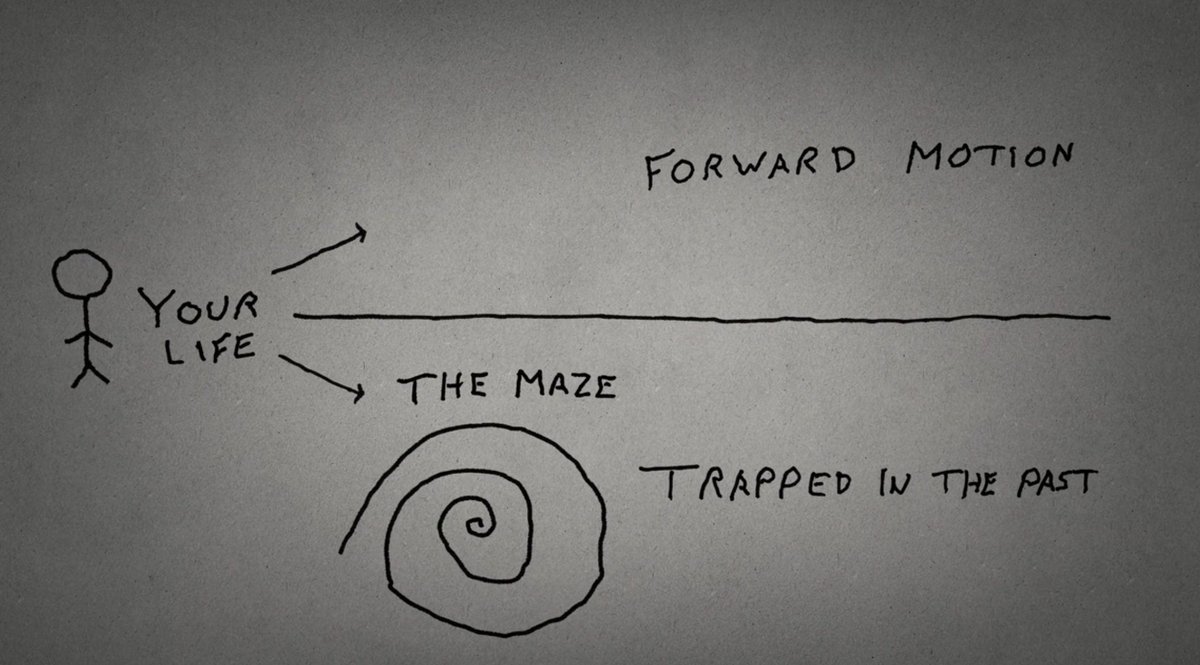 Nuestra parte x suele querer justicia y pone la vida en pausa hasta no recibir un resarcimiento, a veces de una persona, a veces más general.Nos quedamos en un eterno laberinto y no podemos salir después de algo muy terrible que nos hicieron o una tragedia+