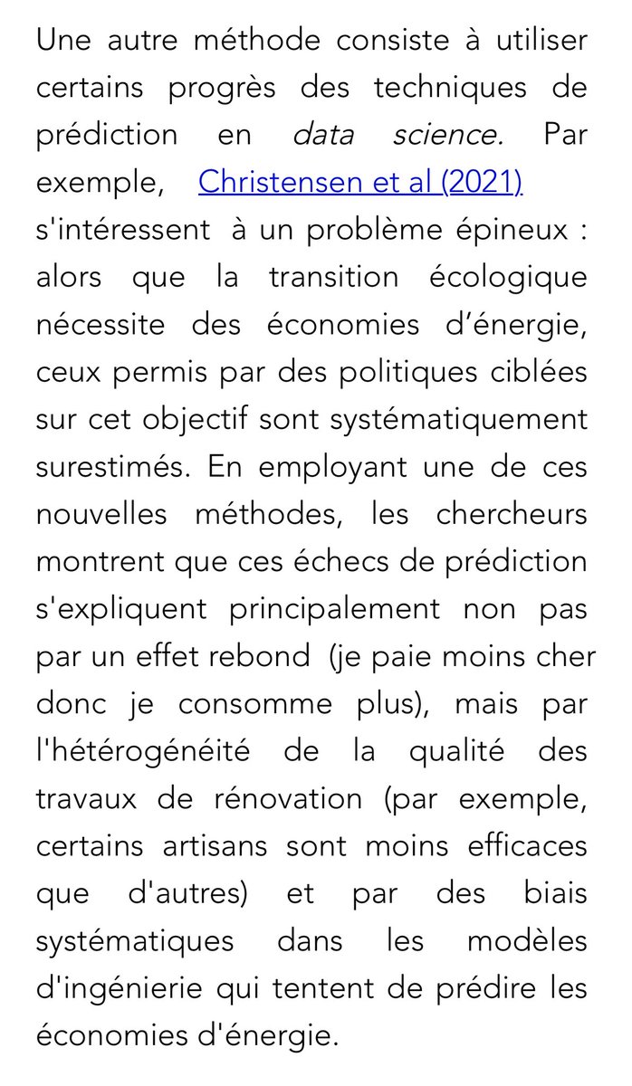 Cette littérature a bénéficié de l’apport de l’ingénierie mais aussi des progrès de l’économétrie pour isoler les effets totaux des politiques d’éco d’énergie (qui dépend aussi des comportements : effet rebond, talent des artisans… ) :