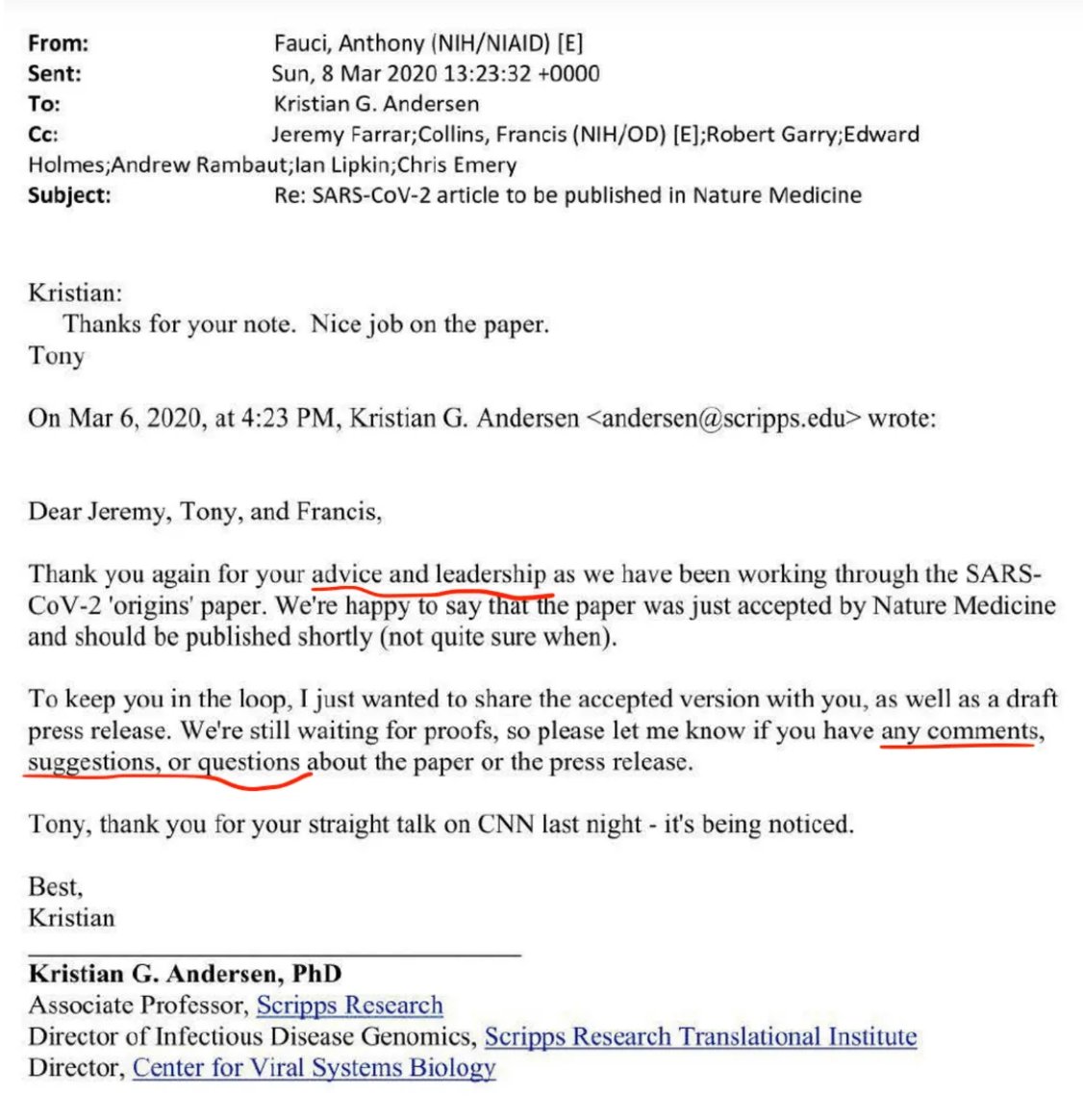 Emails show that Kristian Andersen thanked Farrar, Fauci and Collins for "advice and leadership" on his Nature Medicine paper that shot down a possible Wuhan lab accident. He then sought more comments, suggestions.