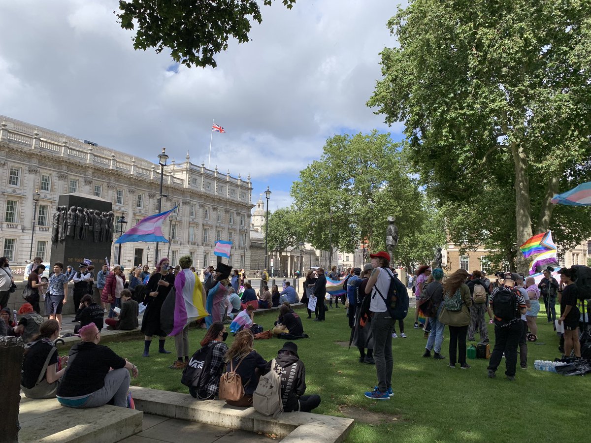 hi i’m vic parsons, @PinkNews’ gender & identity reporter, and i’m here today outside Downing Street for the trans rights protest. the sun has just come out and people are gathering with flags and placards