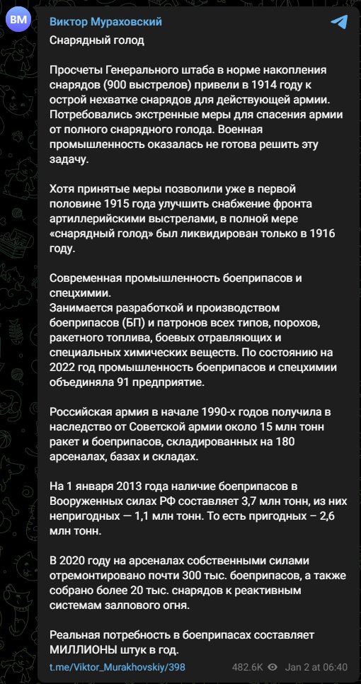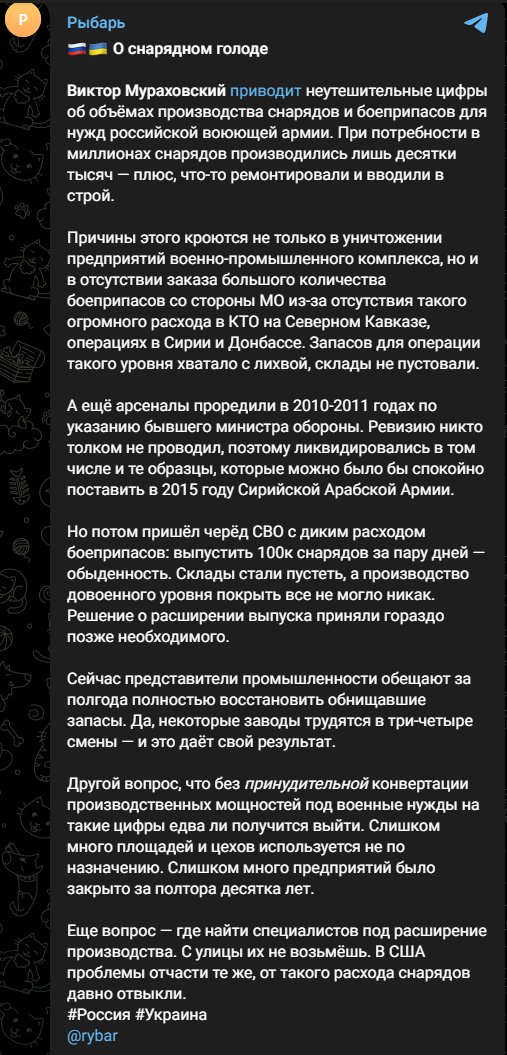 Rybar gave a lower production figure, and said Russia started emptying warehouses with its expenditure rates but waited too long to ramp up production (and blamed former Minister Serdyukov for hurting VPK enterprises). Murakhovksy says they need millions of rounds per year. 2/