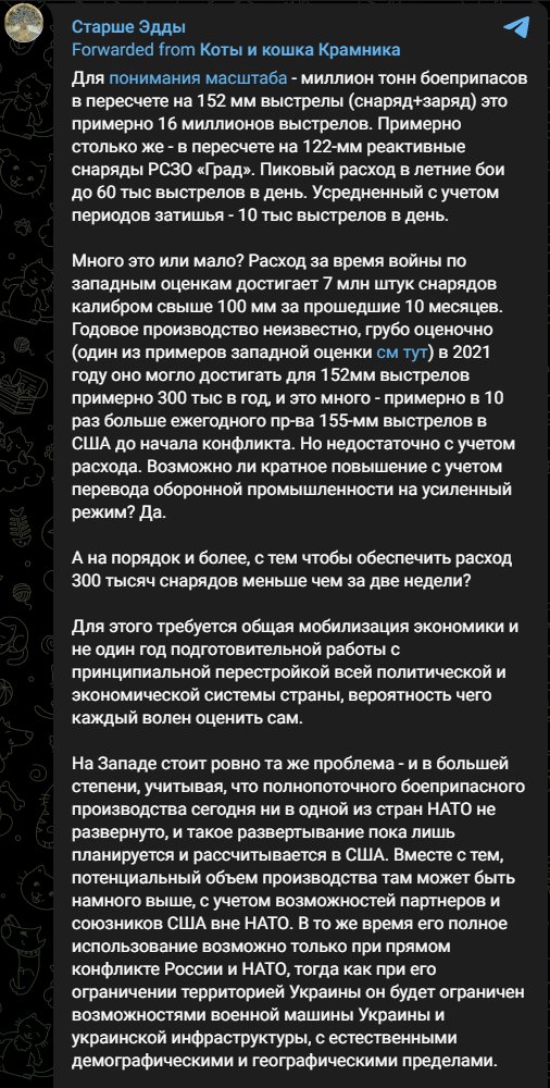 Kramnik suggests, to produce sufficient quantities of shells for this expenditure rate, they would need a general mobilization of the economy, and Rybar questions whether they have enough specialists and that they would need to use civilian factories to produce the ammo. 3/