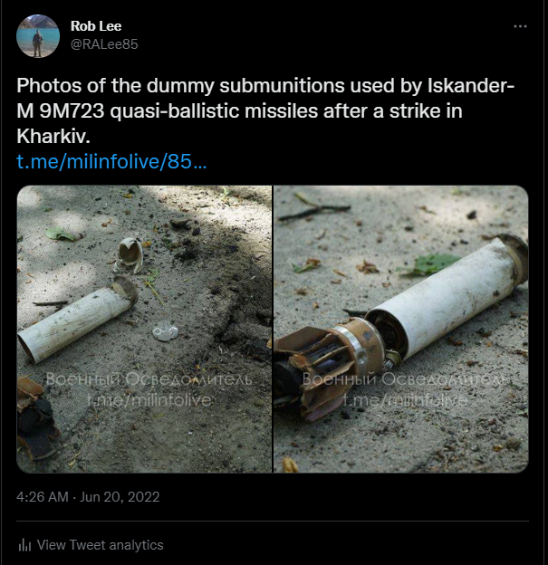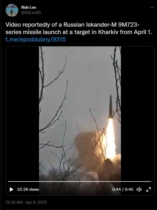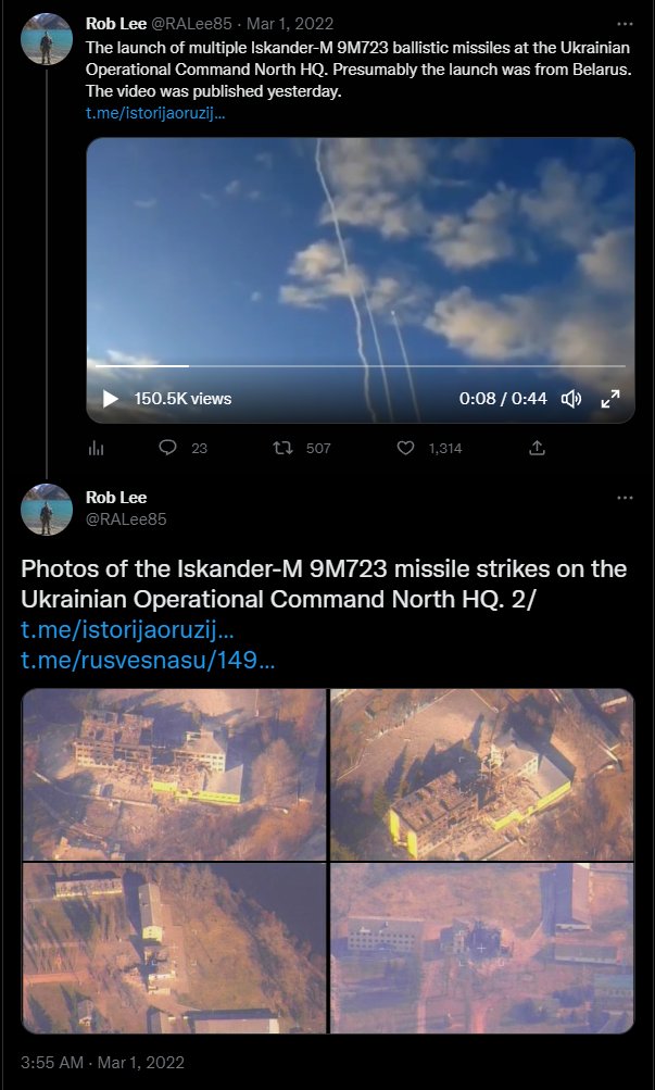 Seeing people suggest that Russia hasn't used ballistic missiles in this war but that isn't accurate. Russia used Iskander-M systems very actively in the beginning (including from Belarus), which can launch 9M723 quasi-ballistic missiles and cruise missiles, as well as Tochka-U.