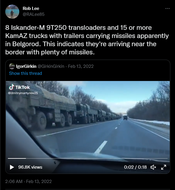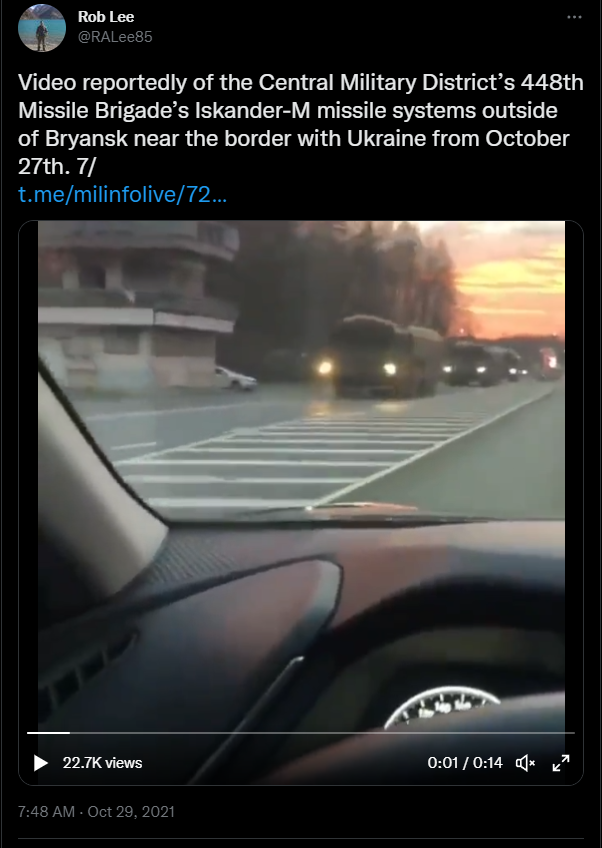 The Iskander-M is a very important system for the Russian Ground Forces and is typically an army-level asset. The deployment of Iskander-M systems from Central Military District's 448th Missile Brigade in the spring of 2021 and movement in October was a key warning sign. 2/