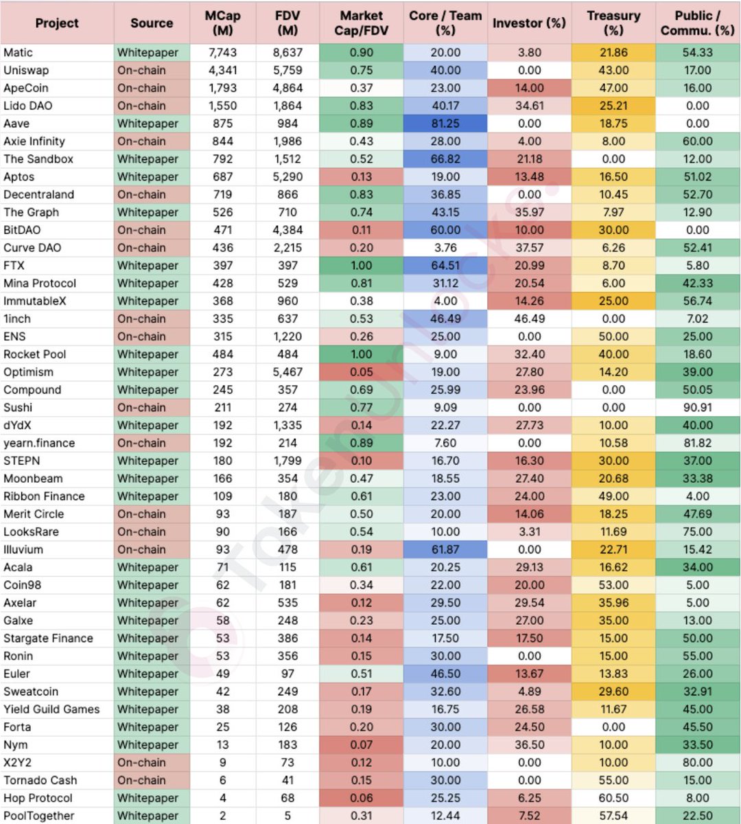 Token allocations vary greatly among projects. Some have no investor or treasury allocation, and others allocate the majority to the core team