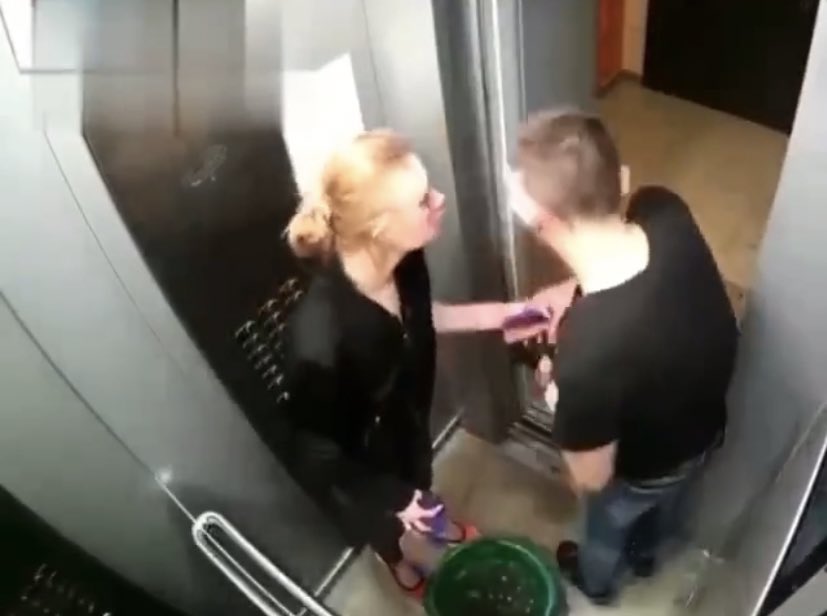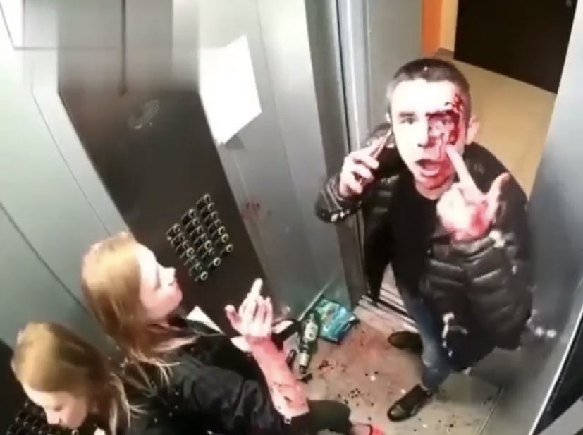 Um vídeo registrado por uma câmera de segurança em Ekaterinburg, na Rússia, mostra a briga chocante de um casal dentro de um prédio. Minutos depois, o par ainda volta para o elevador com panos e com um balde d'água, limpando o sangue que deixaram no local.