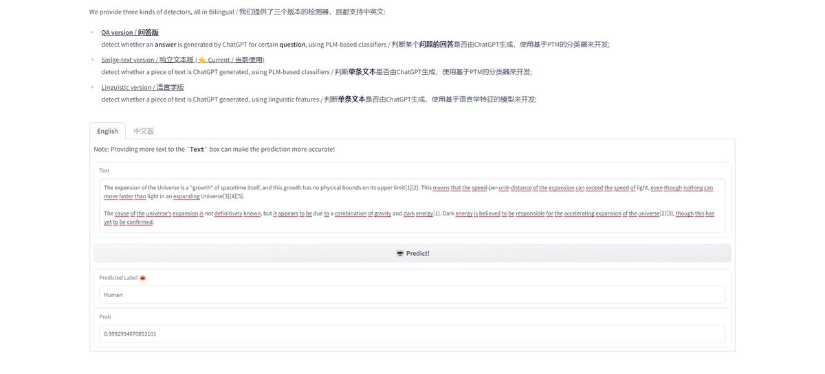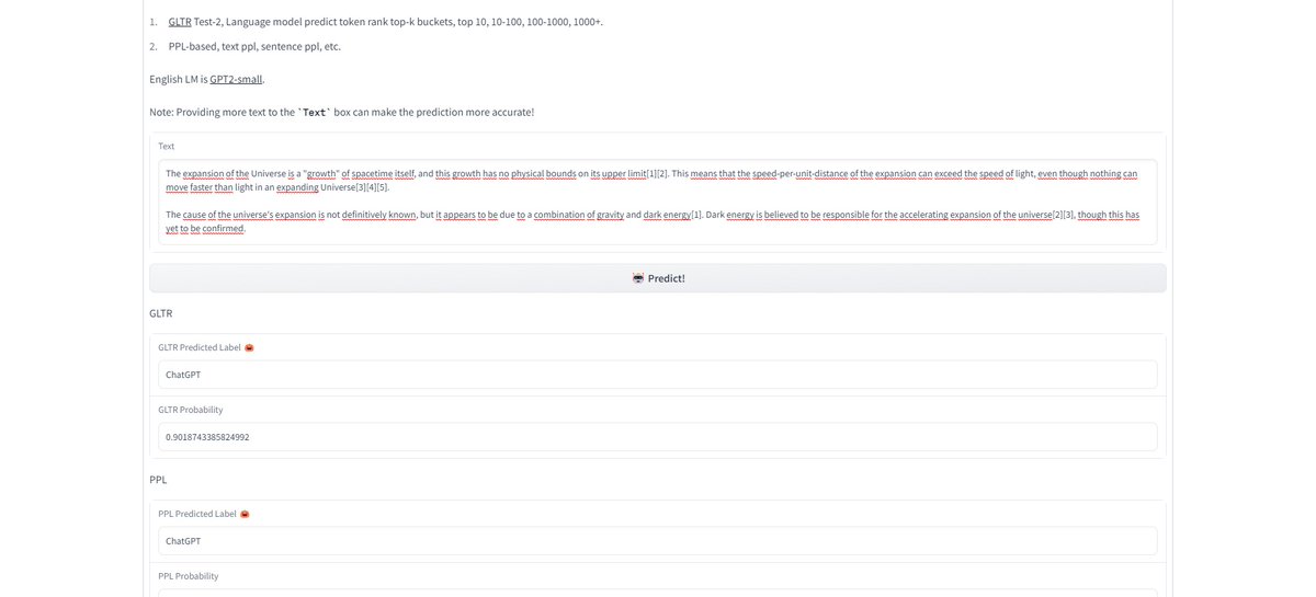Did some "testing" with the #ChatGPT (or #GPT3) detector by Hello-SimpleAI.