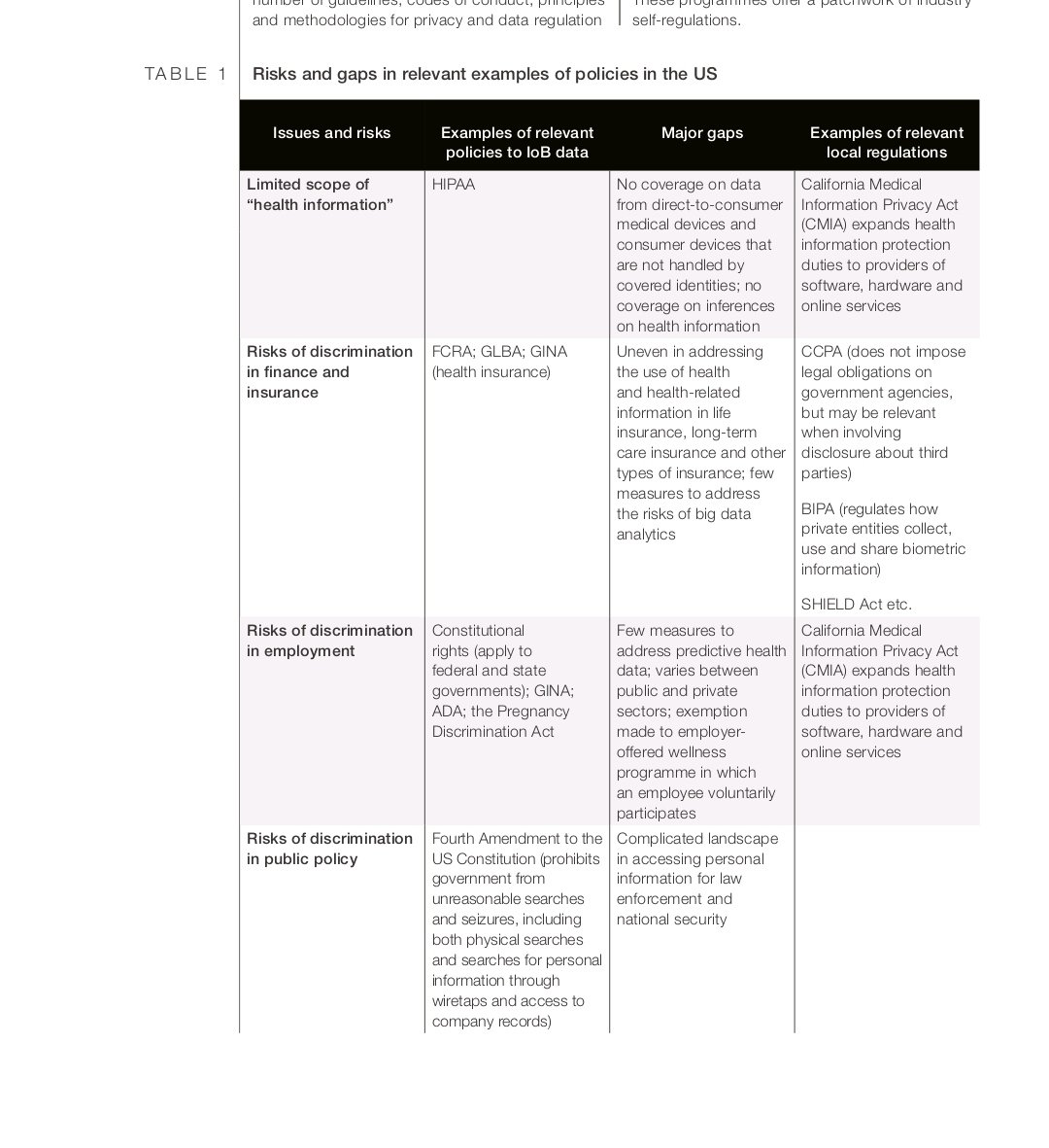 La governance dei dispositivi IoB è gestita attraverso un mosaico di agenzie statali e federali, organizzazioni senza scopo di lucro ,gruppi difesa consumatori