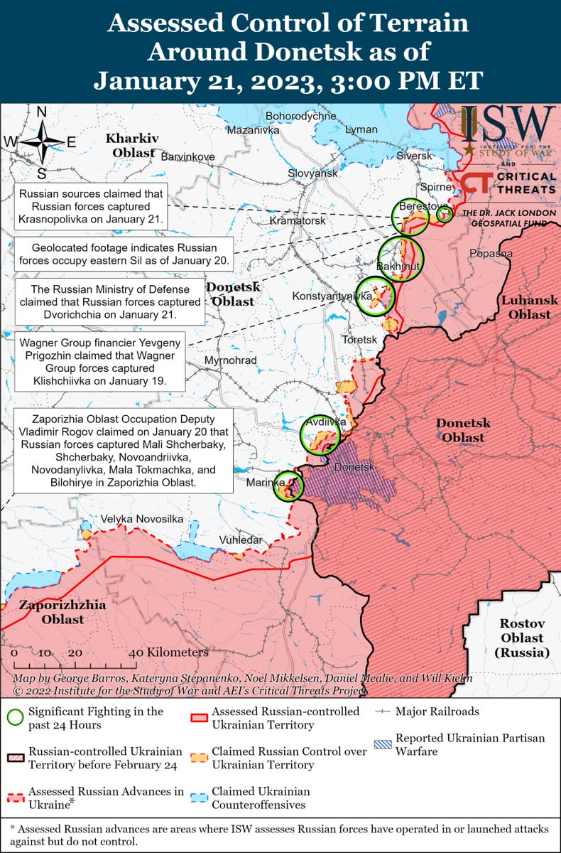 Kring Soledar ser det ut som om lede fi gett upp försöken att avancera vidare och har nu sänt en del av dessa styrkor till Bakhmut. Intensiva strider pågår öst om Bakhmut.