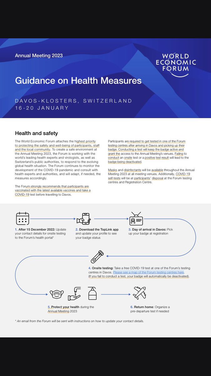 Offensichtlich erkennt das Weltwirtschaftsforum die Tatsache an, dass die #COVID19-Pandemie noch nicht vorbei ist und dass #SARSCoV2 weiterhin eine Gefahr darstellt. Mit umfangreichen Maßnahmen wird die Gesundheit der Teilnehmer geschützt.