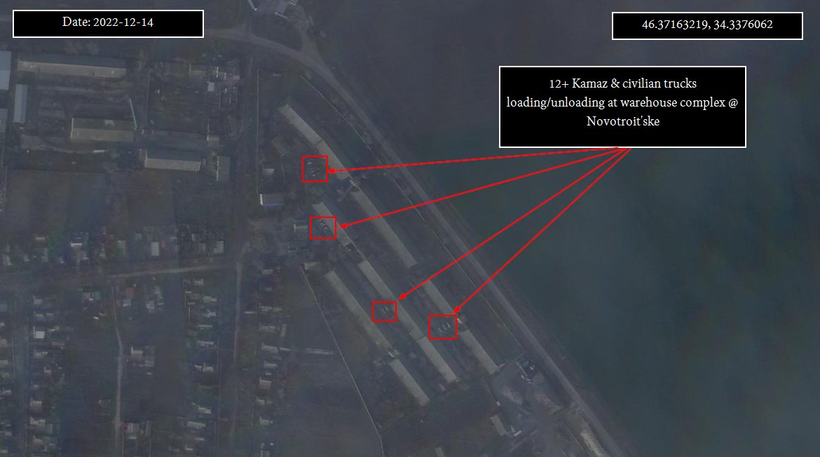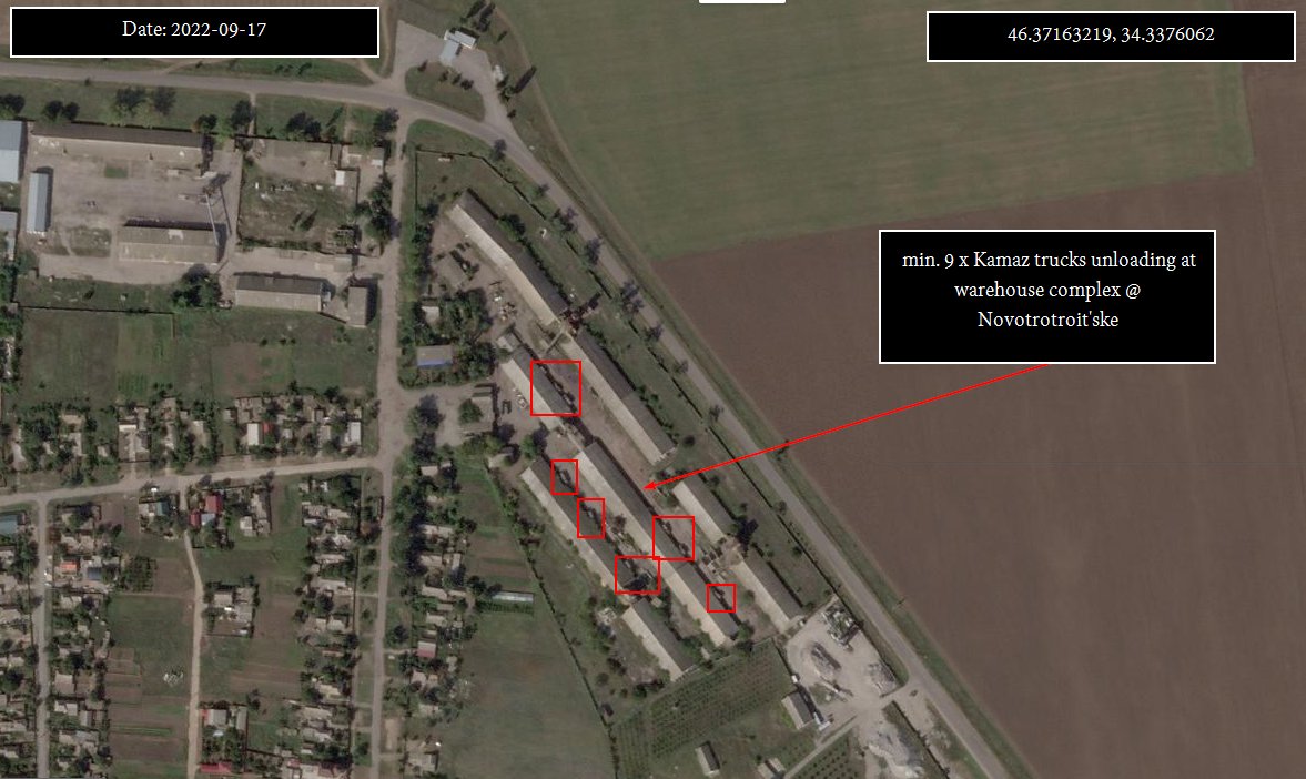 6/11 most likely loading building materials for the defensive works still being build by ๐ท๐บ forces. To still be able to supply the frontlines, a supply hub for trucks was established just 25 km's north in the town of Novotroit'ske multiple warehouses along the road are used
