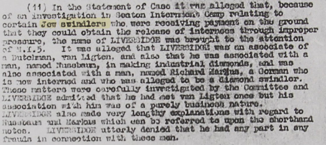 A Home Office advisory committee report referred to an investigation into "Jew swindlers" (with which Liversidge was alleged to be involved in)