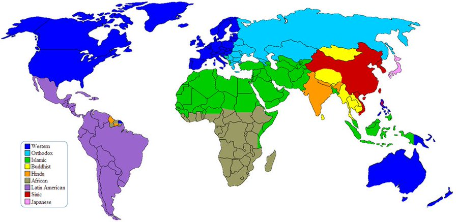 If Huntington was sticking to his religion as the "most important" indicator of Culture, then perhaps he used that as the basis for his map? This map of major world religions from @pewresearch actually looks fairly similar to Huntington's map.